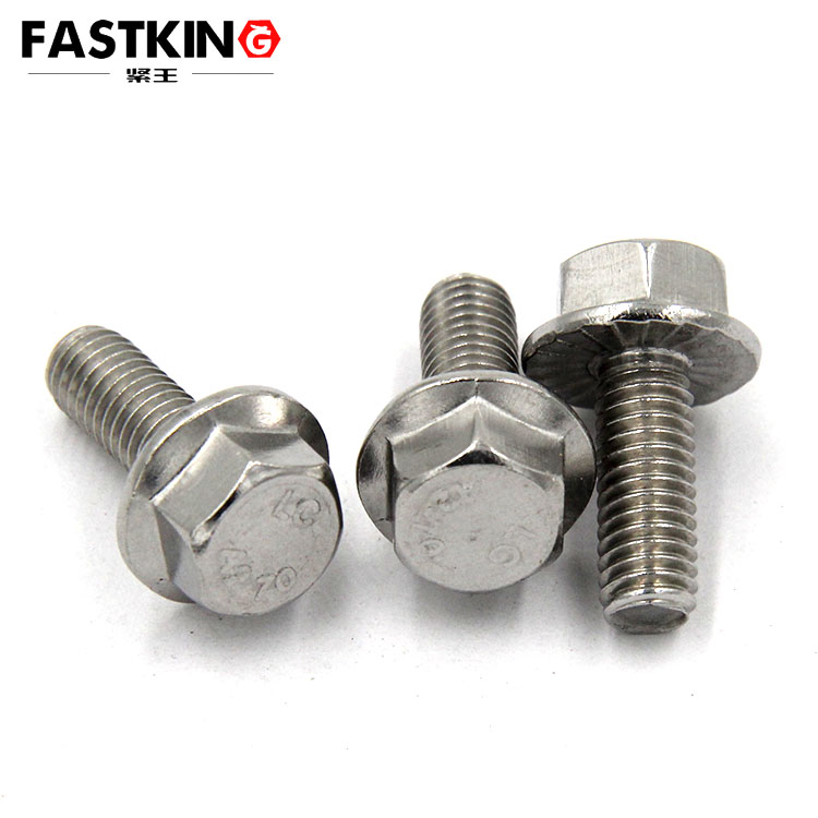 由六角头部与法兰盘构成 —— 这里的法兰盘相当于与六角头部固定连接的 “内置垫片”,无需像普通螺栓那样额外搭配平垫,从根源上避免了安装时垫片丢失或错位的问题。六角头部采用经典的正六边形设计,这种形状能与扳手形成稳定的贴合面,无论是使用开口扳手、梅花扳手还是套筒扳手,都能轻松施加足够扭矩,既方便安装时的快速拧紧,也便于后续维护时的拆卸操作,尤其在空间相对开阔的工况下,六角结构的优势更为明显。而法兰盘的设计则分为两种常见类型:一种是平面法兰盘,其表面光滑平整,与被连接件接触时能形成均匀的压力分布,可有效保护零件表面不受损伤,特别适合连接表面精度较高的零部件,如精密仪器的外壳拼接;另一种是带花齿的法兰盘,其底部分布着细密的凸起齿状结构,在拧紧过程中,这些花齿能轻微嵌入被连接件的表面(通常是金属或高强度塑料材质),形成 “咬合” 效果,大幅增强防滑性能,即便在设备长期振动的环境中,也能有效防止螺栓松动,比如汽车发动机舱内的部件连接、大型风机的底座固定等场景,带花齿法兰盘的防滑特性就显得尤为重要。